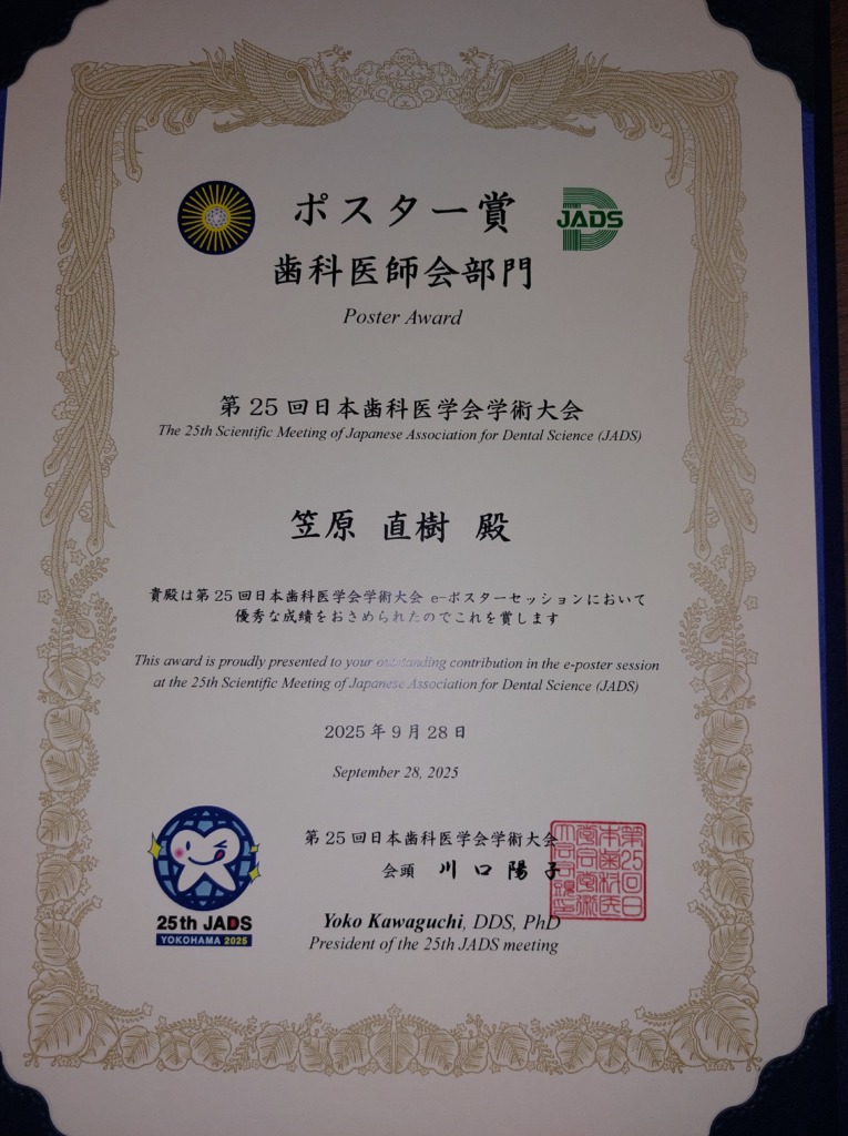 第25回日本歯科医学会学術大会のeポスター部門に発表し、ポスター賞を頂きました。